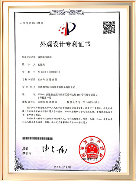 中国梦组合艺术花箱专利证书