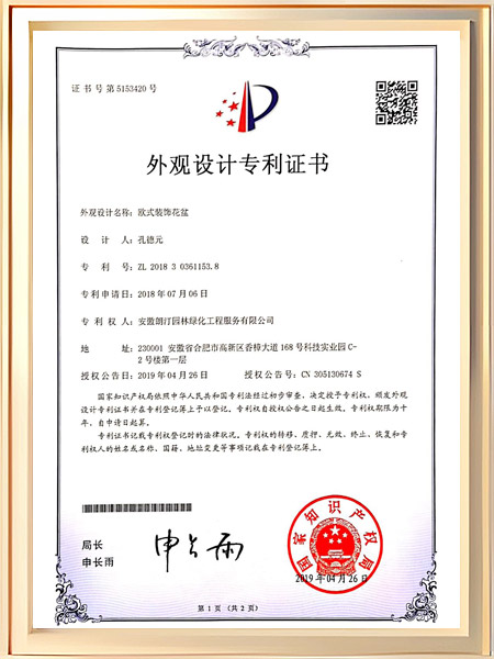 欧式装饰花盆专利证书