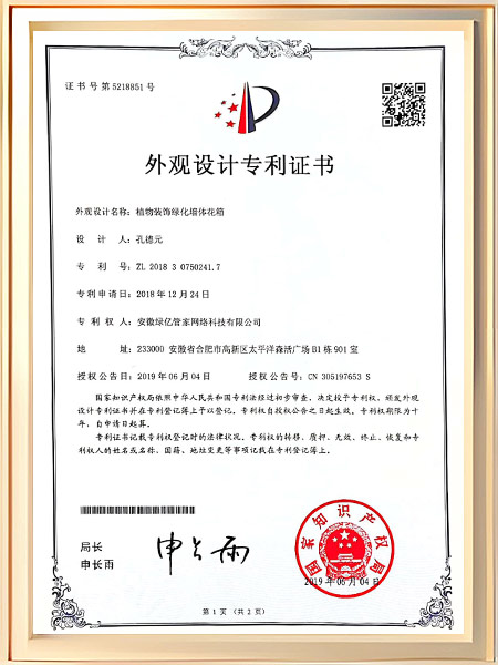 植物装饰绿化墙体花箱专利证书